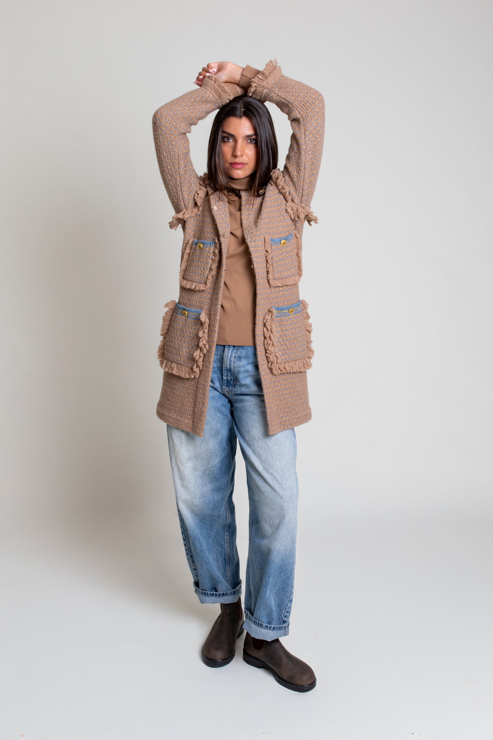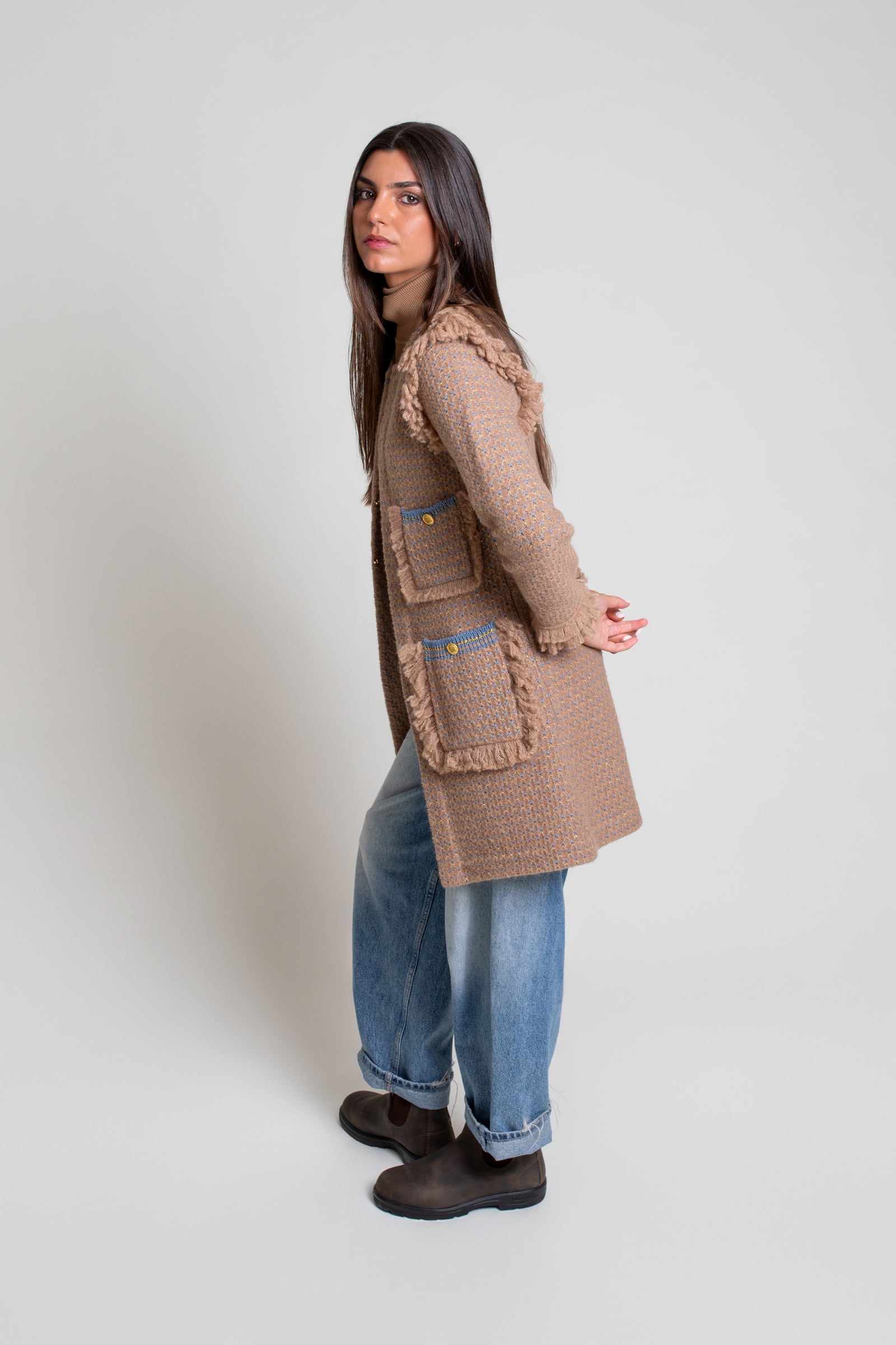 • Abrigo tipo tweed en punto tricot. Modelo de corte recto con falsos bolsillos en delantero. Cuello caja y manga larga con adorno de flecos en puños y sisas. Cierre frontal con ganchos metálicos