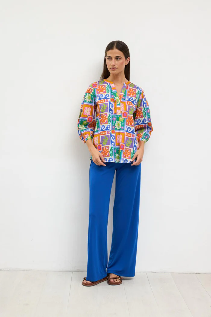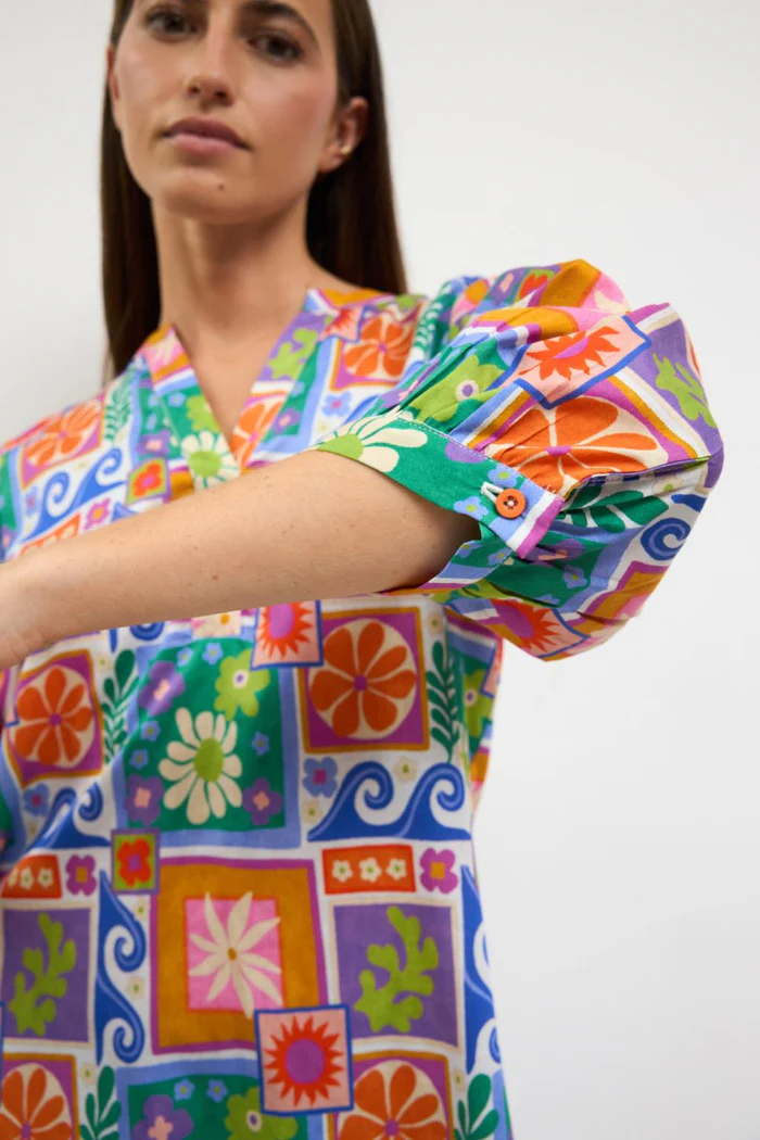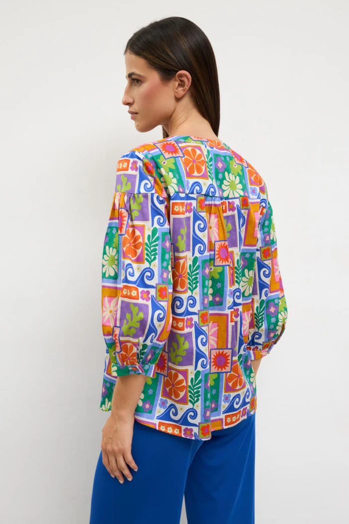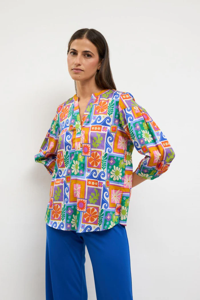 - Blusa de manga larga abullonada. Cuello mao. Detalles de estampado geométrico retro multicolor. Escote en pico. Bajo recto.
