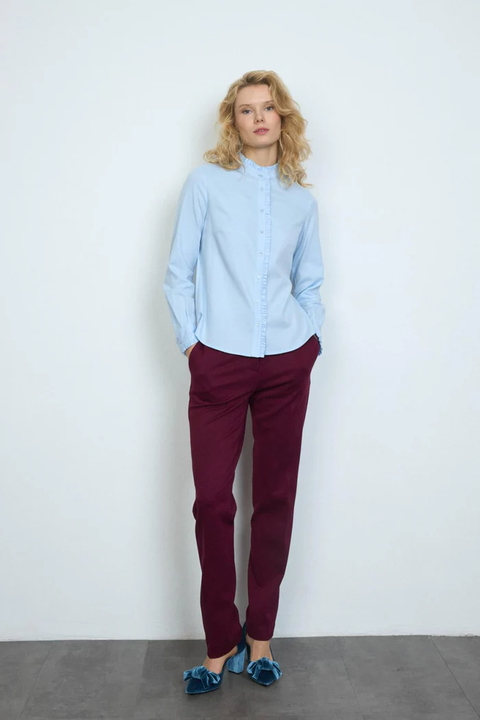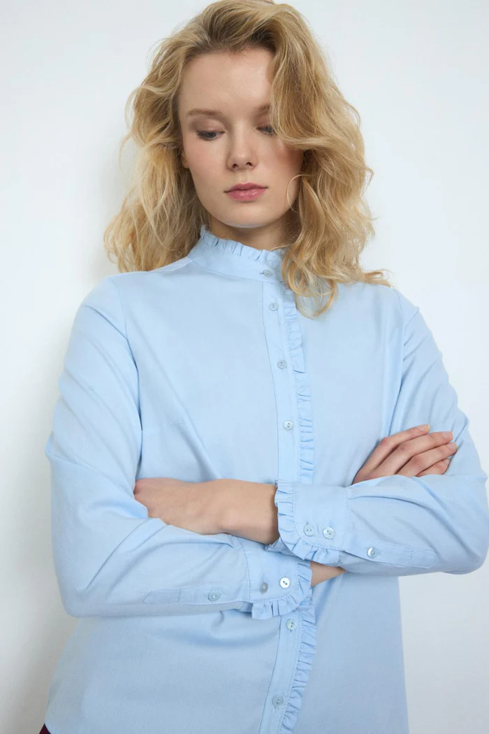 • Camisa lisa de popelín. Diseño entallado. Cuello redondo con detalle de volante fruncido. Cierre frontal con botones al tono y detalle de volante fruncido coordinado. Manga larga terminada en puño con cierre de botones y detalle de volante. Bajo redondeado
