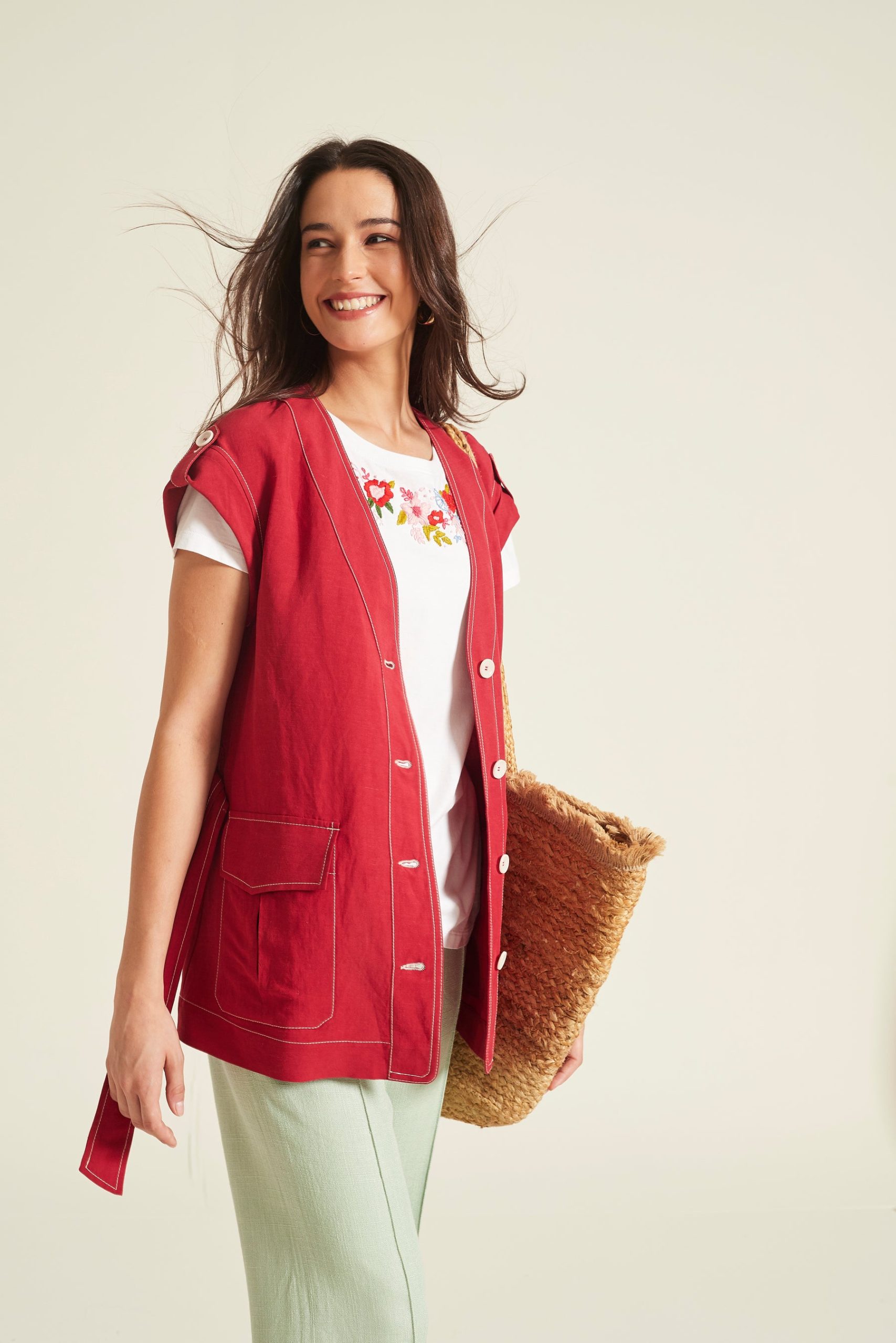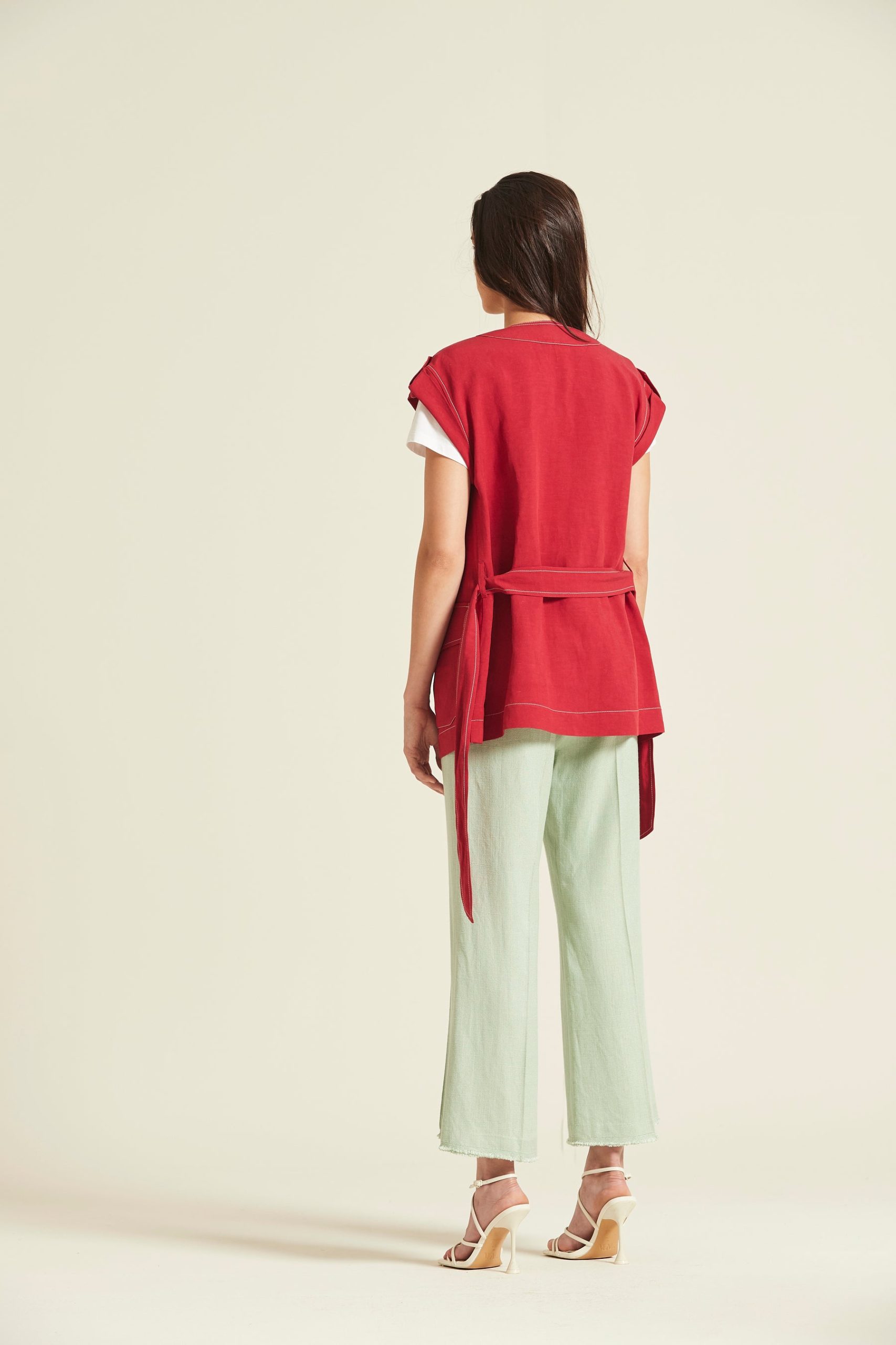 • Chaleco de cuello redondo y manga corta japonesa confeccionado en una mezcla fluida de viscosa y lino en color rojo intenso. Presenta un cierre frontal de botones blancos y destaca por sus pespuntes a contraste que resaltan las costuras y los hombros, donde incluye un detalle de trabilla decorativa.