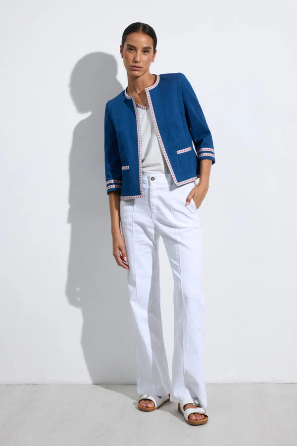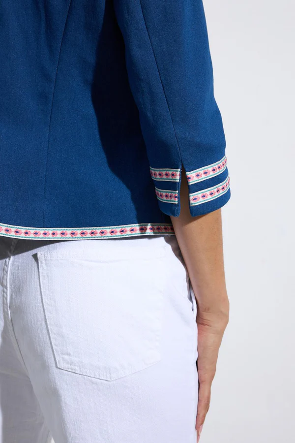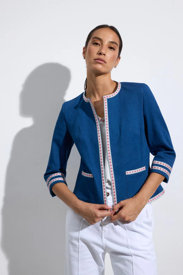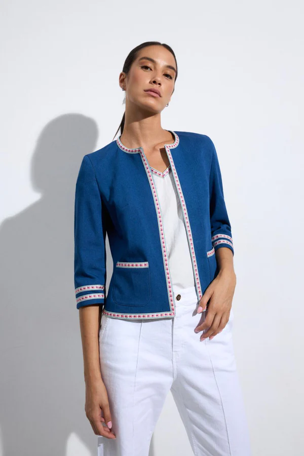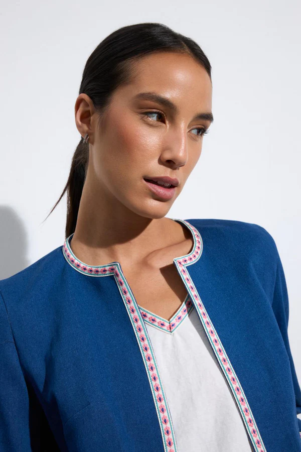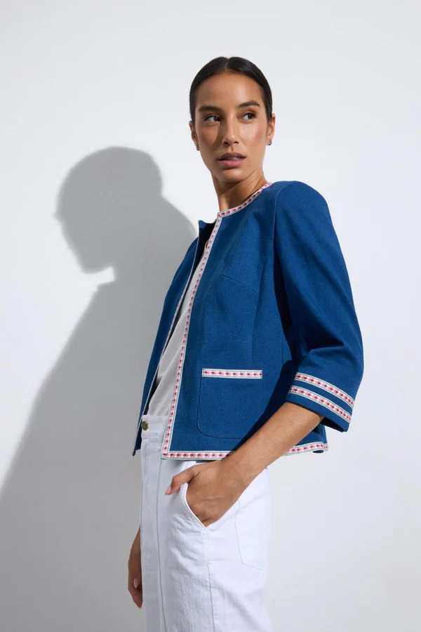 - Chaqueta corta de manga francesa. Cuello redondo tipo caja. Detalle de vivos étnicos bordados en el frontal, bolsillos y puños. Diseño abierto. Corte recto.Diseñado y fabricado en España