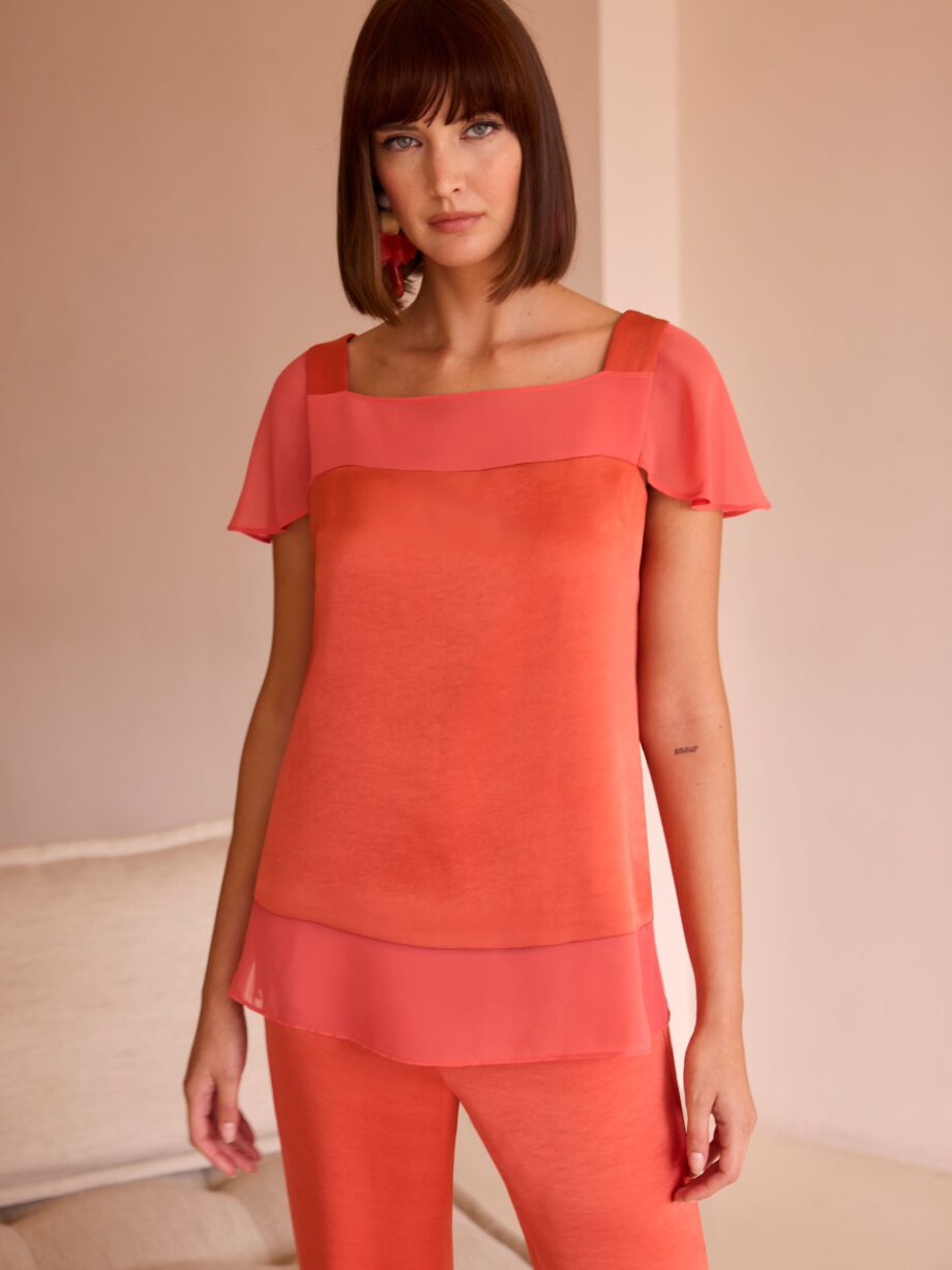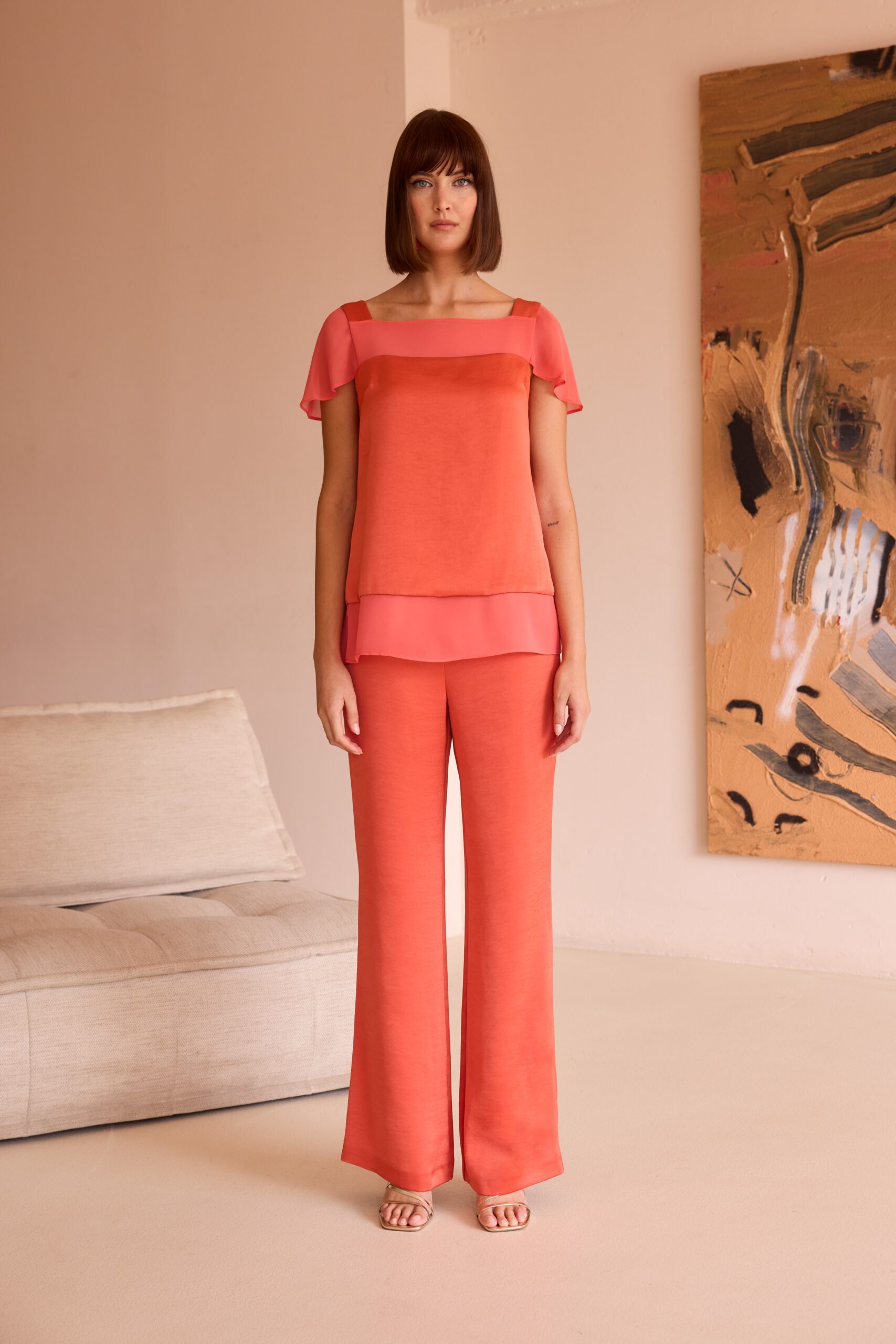 Incluye top sin mangas, pantalón recto de caída fluida y una sobrecapa tipo chaqueta abierta, que añade un toque de distinción y estiliza la silueta. Su diseño depurado y su caída suave lo convierten en una opción perfecta para invitadas, eventos de día o celebraciones especiales donde prima la elegancia sin renunciar a la comodidad.