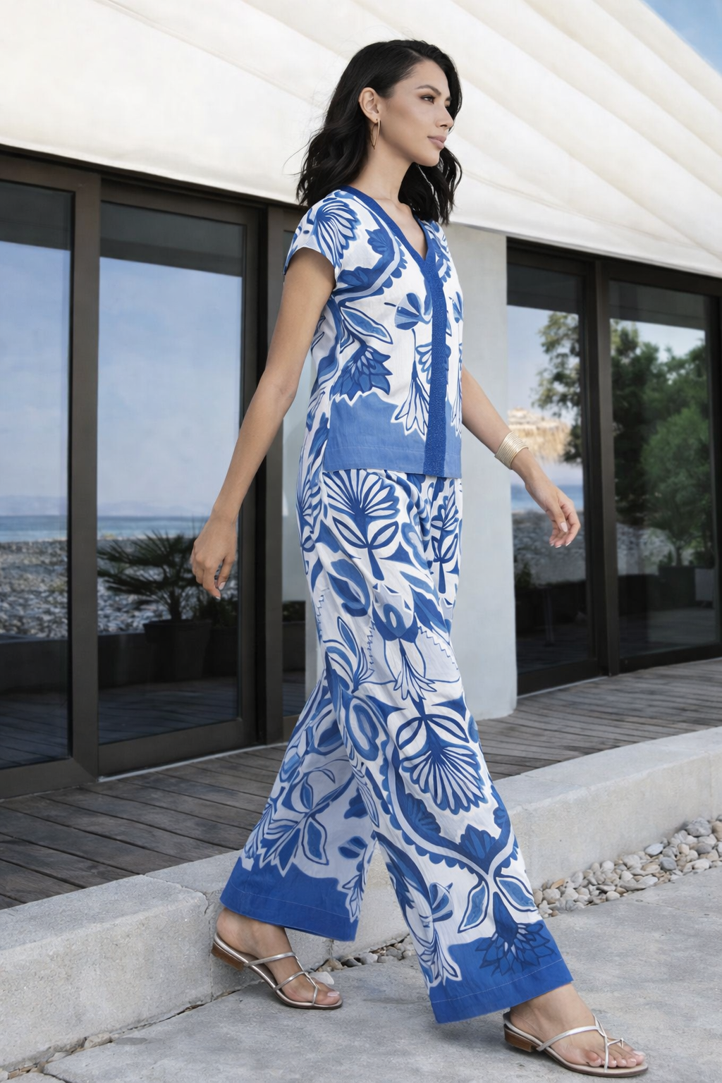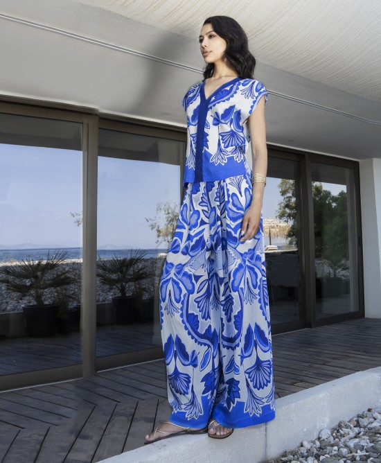 - Conjunto de dos piezas con estampado floral en tonos azul y blanco, pensado para mujeres que buscan comodidad sin renunciar al estilo. El top presenta un favorecedor escote en pico y una franja azul central que aporta estructura y realza la silueta. Su caída es ligera y fluida, ofreciendo libertad de movimiento y un ajuste agradable.El pantalón es largo y de corte ancho, diseñado para aportar confort y elegancia. Su tejido suave y transpirable lo hace ideal para los días más cálidos, manteniendo una sensación fresca y ligera al llevarlo.Este conjunto es perfecto para ocasiones informales, paseos junto al mar o planes de verano, combinando fácilmente con sandalias planas o de tacón bajo. Una opción versátil y femenina para completar tu armario de temporada.