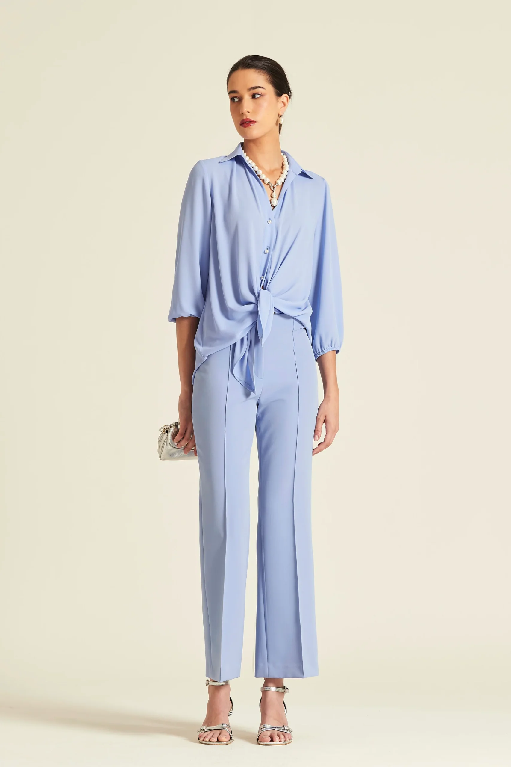 Camisa de silueta fluida confeccionada en gasa de color azul lavanda. Destaca por su cierre frontal con botones tipo perla y un bajo acabado en lazada que permite ajustar la prenda con un nudo informal pero elegante.COMPOSICIÓN: 100% POLIESTERPantalón Watson Plana Stretch