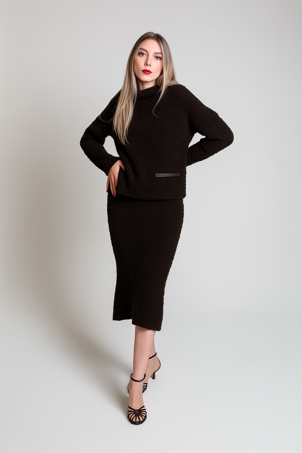 Falda midi corte sirena en buclé de punto. Cintura con goma