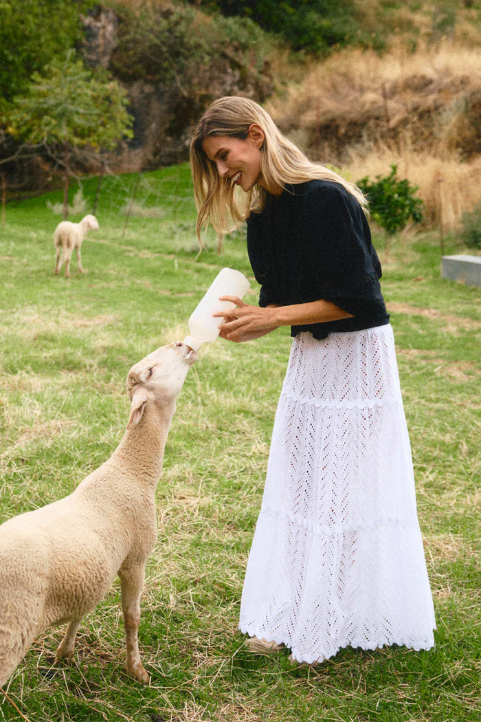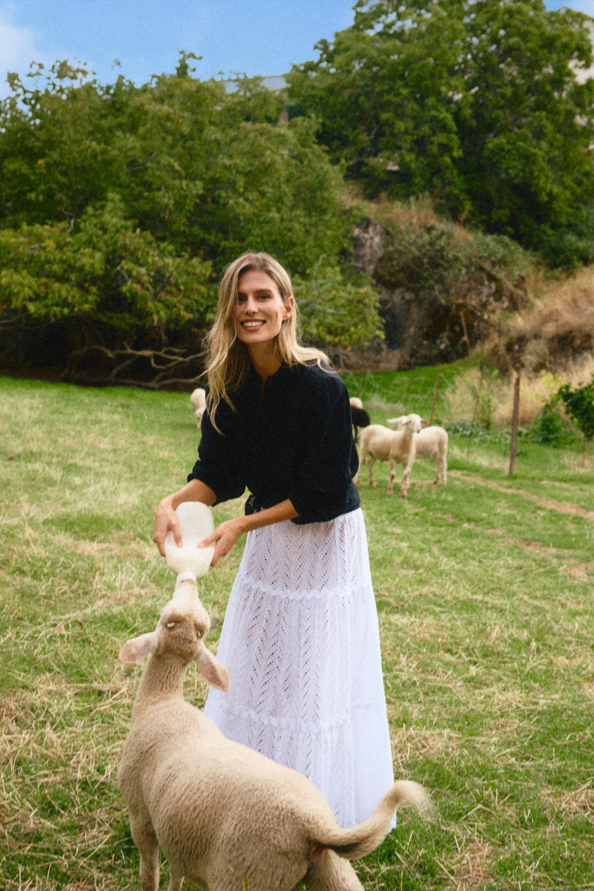- Falda larga calada. Diseño amplio. Tejido suave y fluido ligeramente elástico. Cintura elástica. Bajo avolantado.