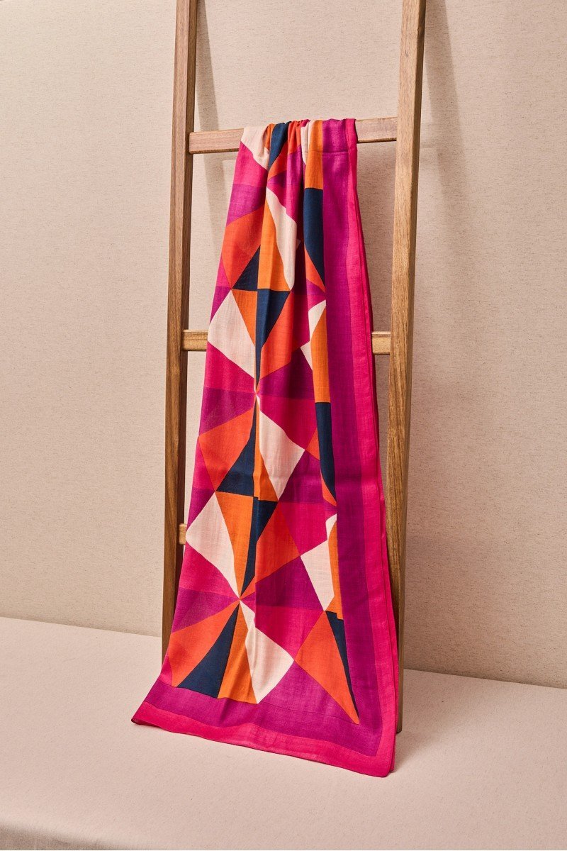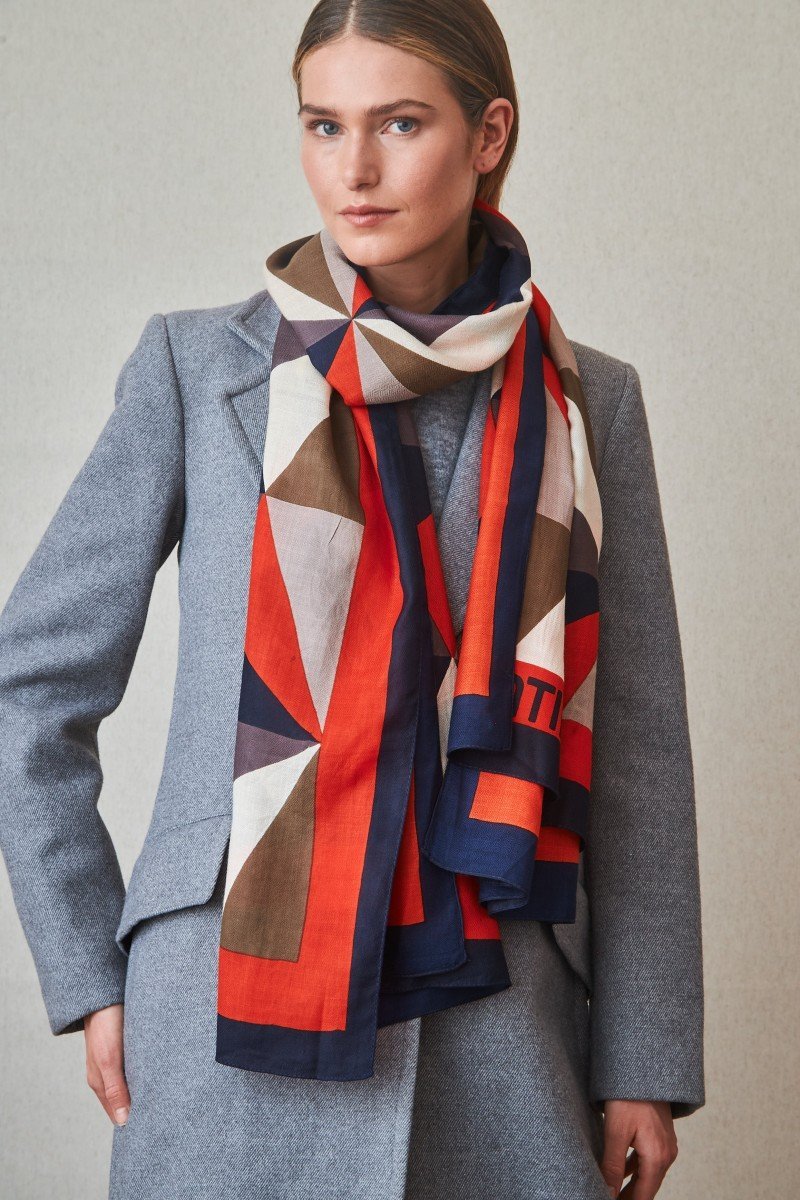 • Fular de lyocell con diseño geométrico en bloques de color y contrastes vibrantes. Un patrón contemporáneo que aporta dinamismo y modernidad a cualquier look.