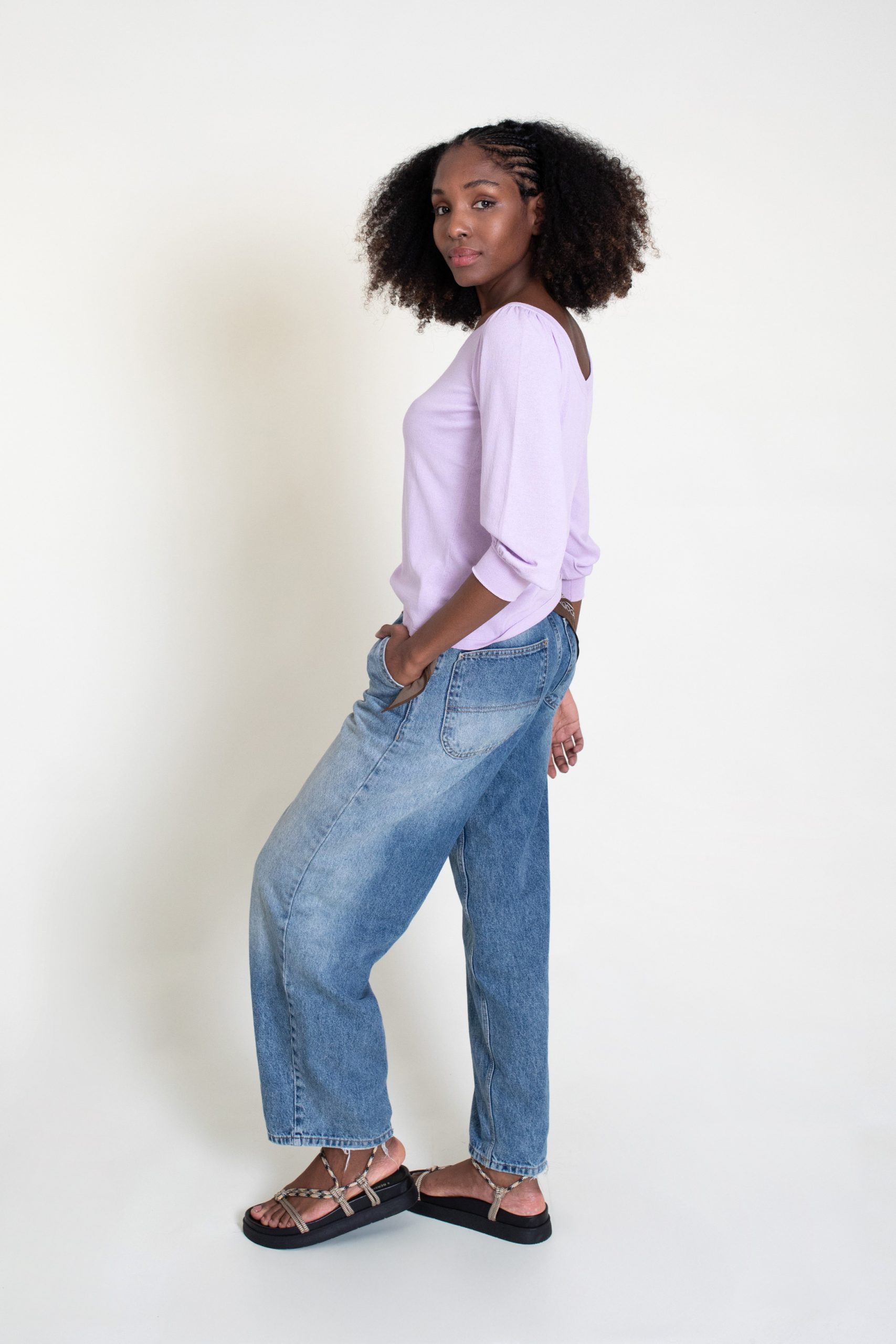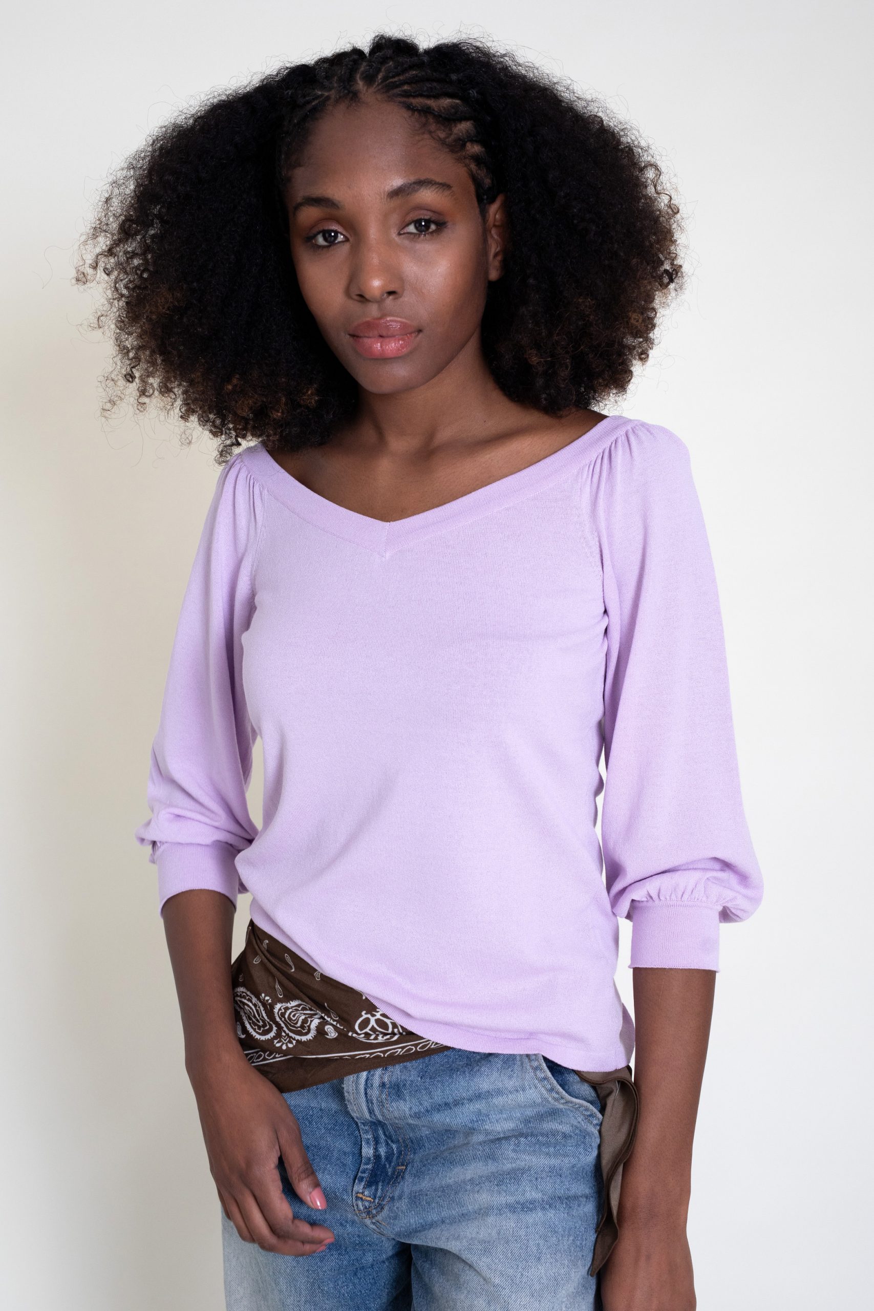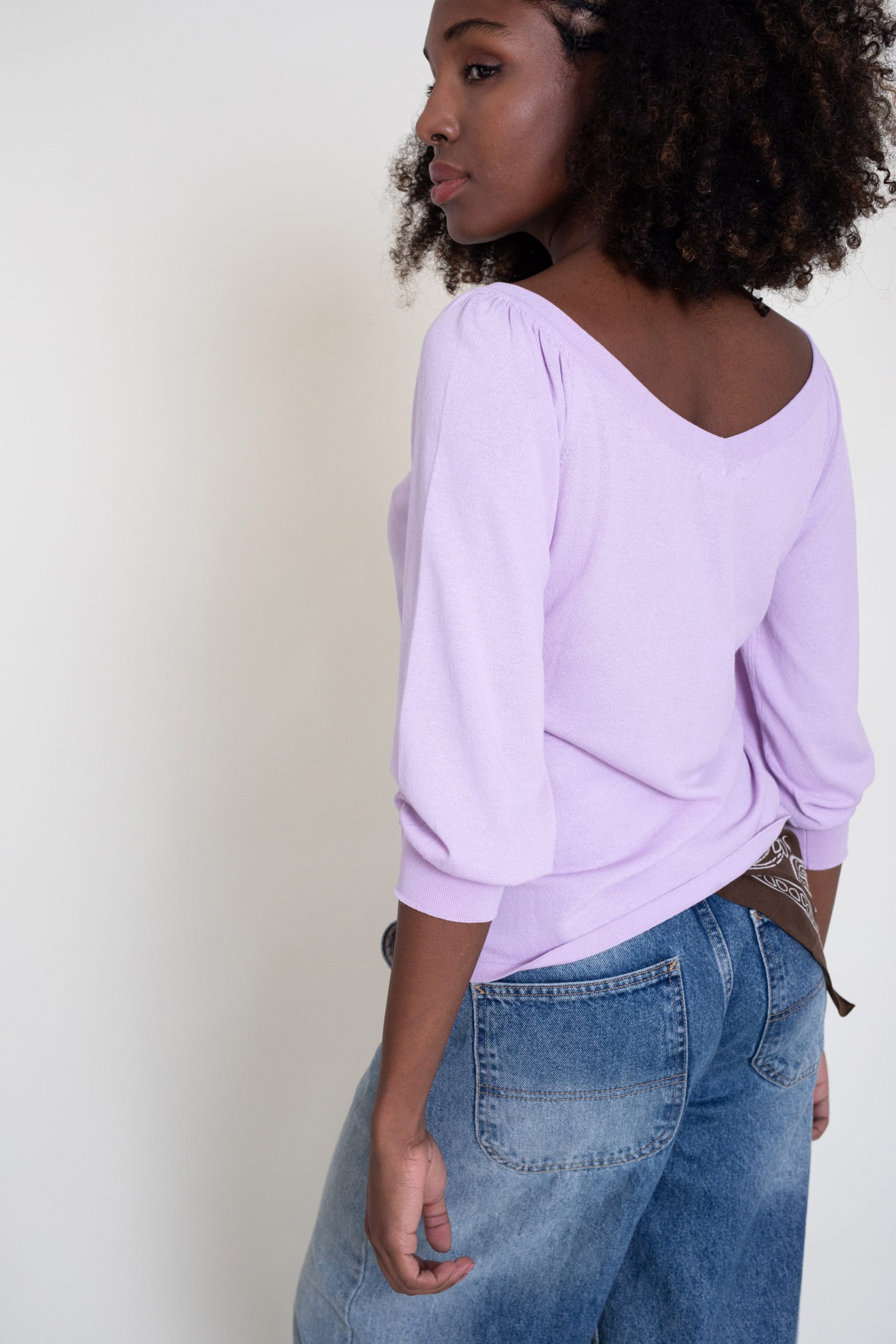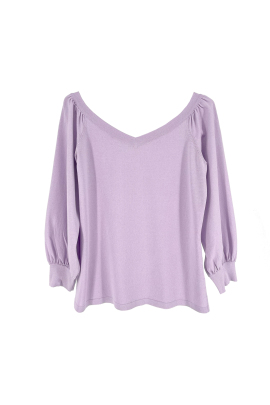 • Jersey de punto tricot con manga 3/4 ligeramente fruncida con puño estrecho. Corte recto y amplio escote en pico