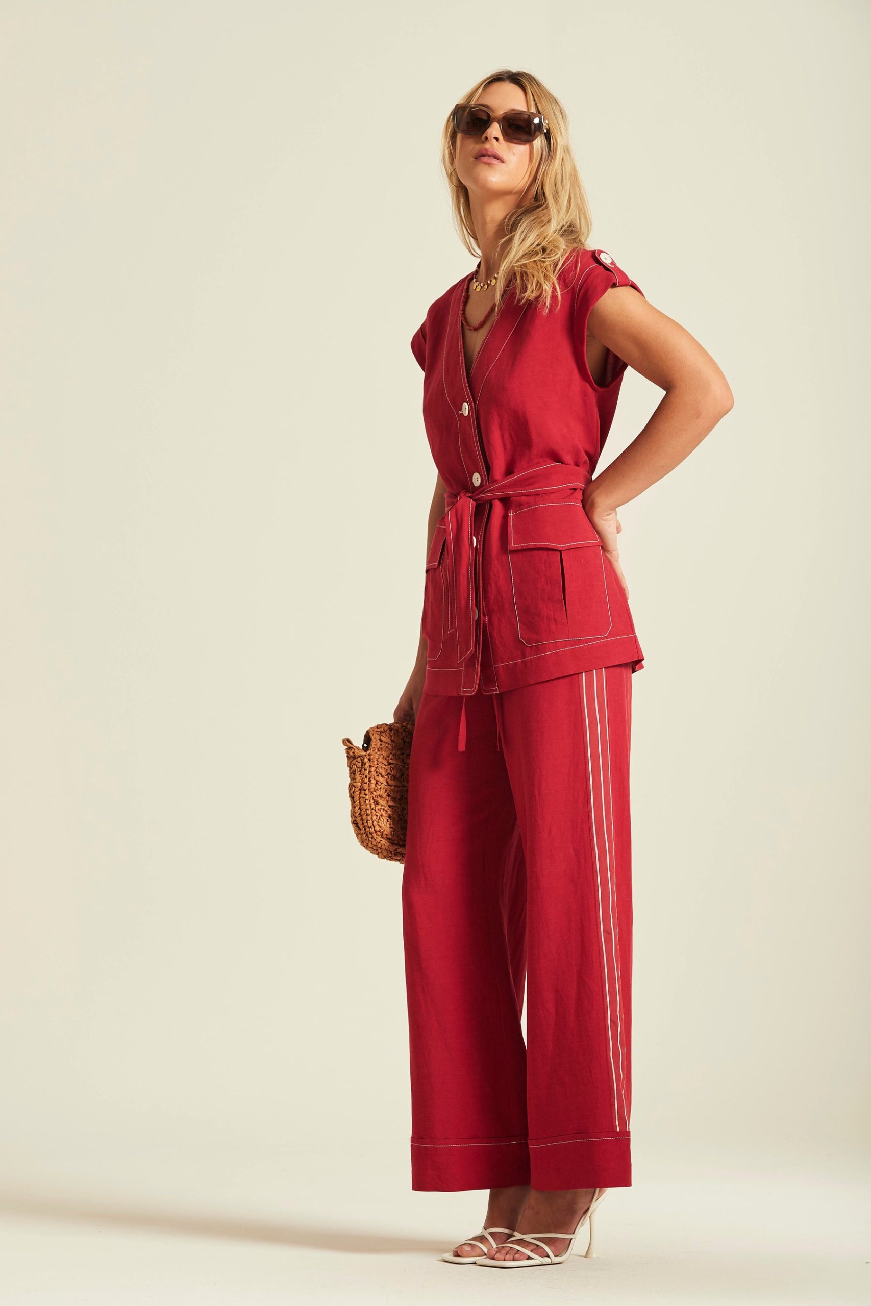 - Pantalón de pernera ancha y recta confeccionado en una mezcla de viscosa y lino color rojo intenso. Presenta una cómoda cintura elástica y destaca por sus pespuntes blancos en contraste y el detalle de triple línea lateral que estiliza la silueta.