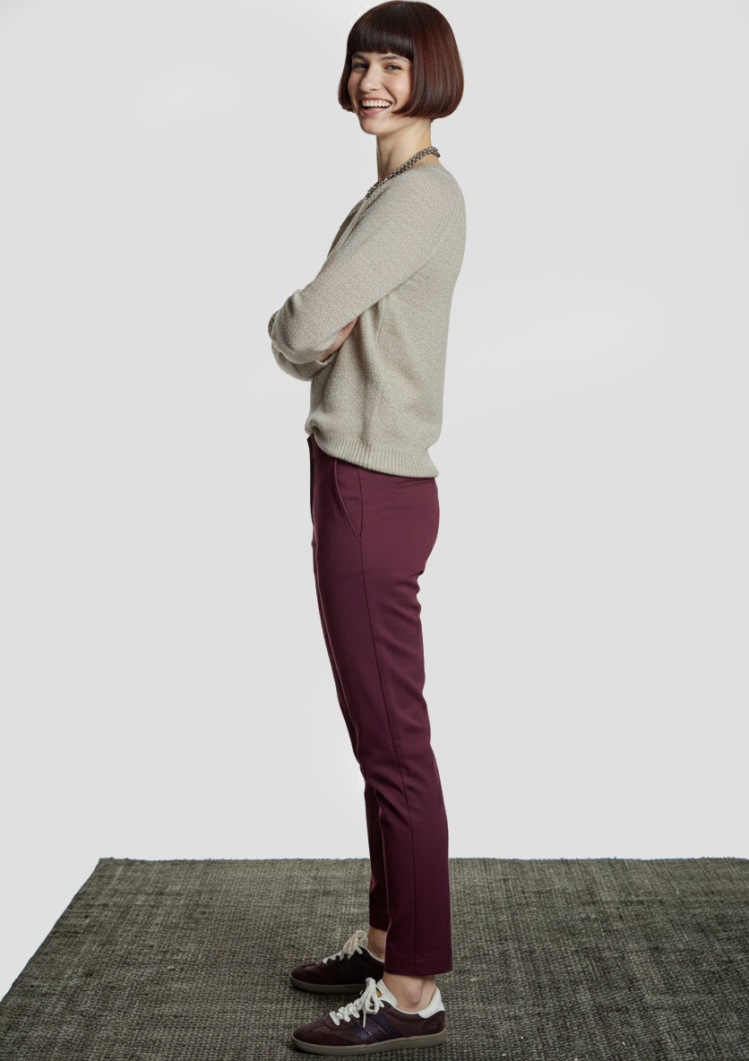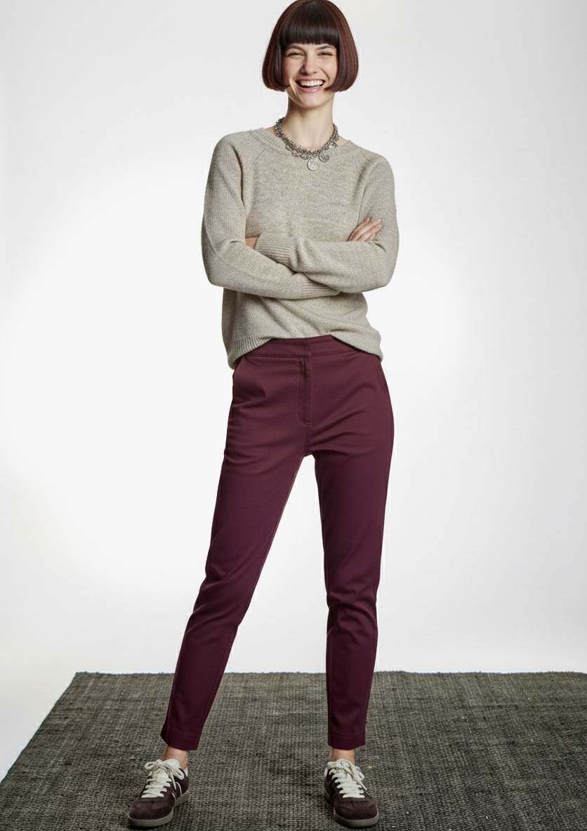 - Pantalón básico AC de corte entallado. Este modelo de tiro medio presenta bolsillos laterales delanteros y de vivo simulados posteriores. Detalle de aberturas laterales en bajos. Cierre central delantero con cremallera oculta por sopata, botón y enganche interior.