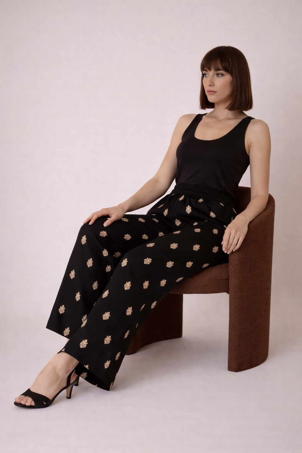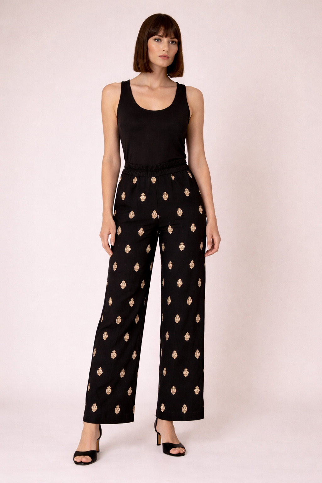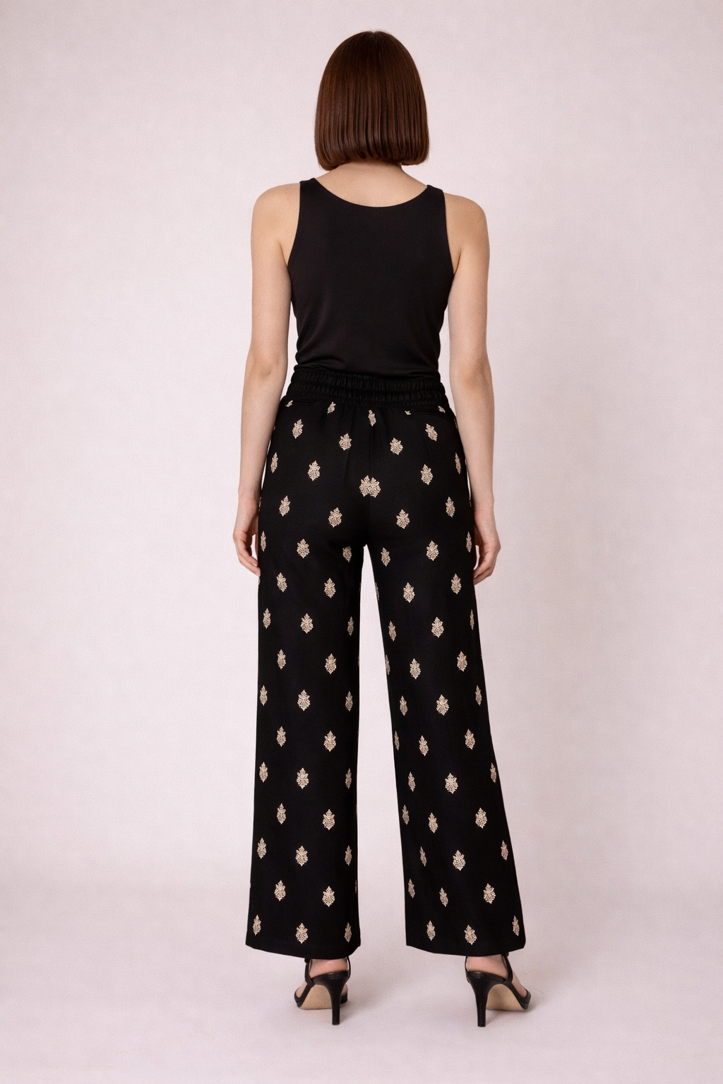 - Pantalón fluido en color negro con motivo bordado en beige, un diseño cómodo y elegante perfecto para el día a día o para ocasiones especiales.Su tejido ligero y su corte recto aportan una caída muy favorecedora, mientras que la cintura elástica garantiza comodidad durante todo el día.