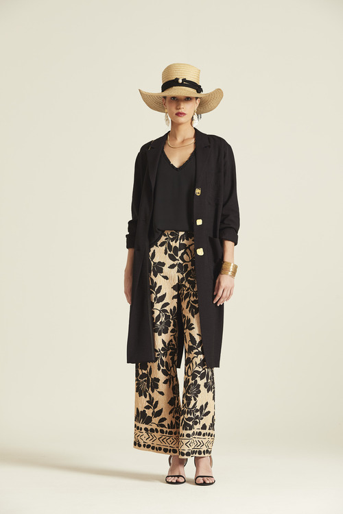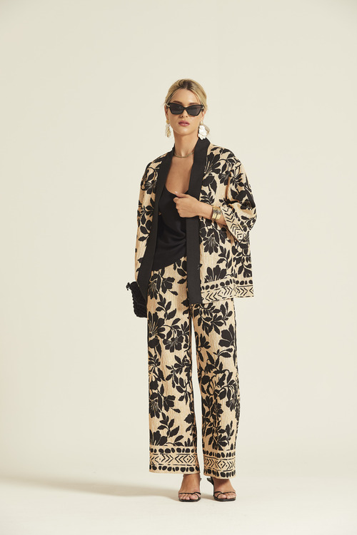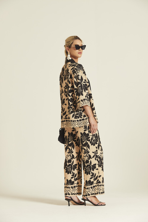 - Pantalón de pata ancha confeccionado en viscosa ligera con textura rugosa. Presenta un elegante estampado botánico en negro sobre fondo arena, una cómoda cintura elástica y un detalle de cenefa geométrica en el bajo que enmarca el diseño.