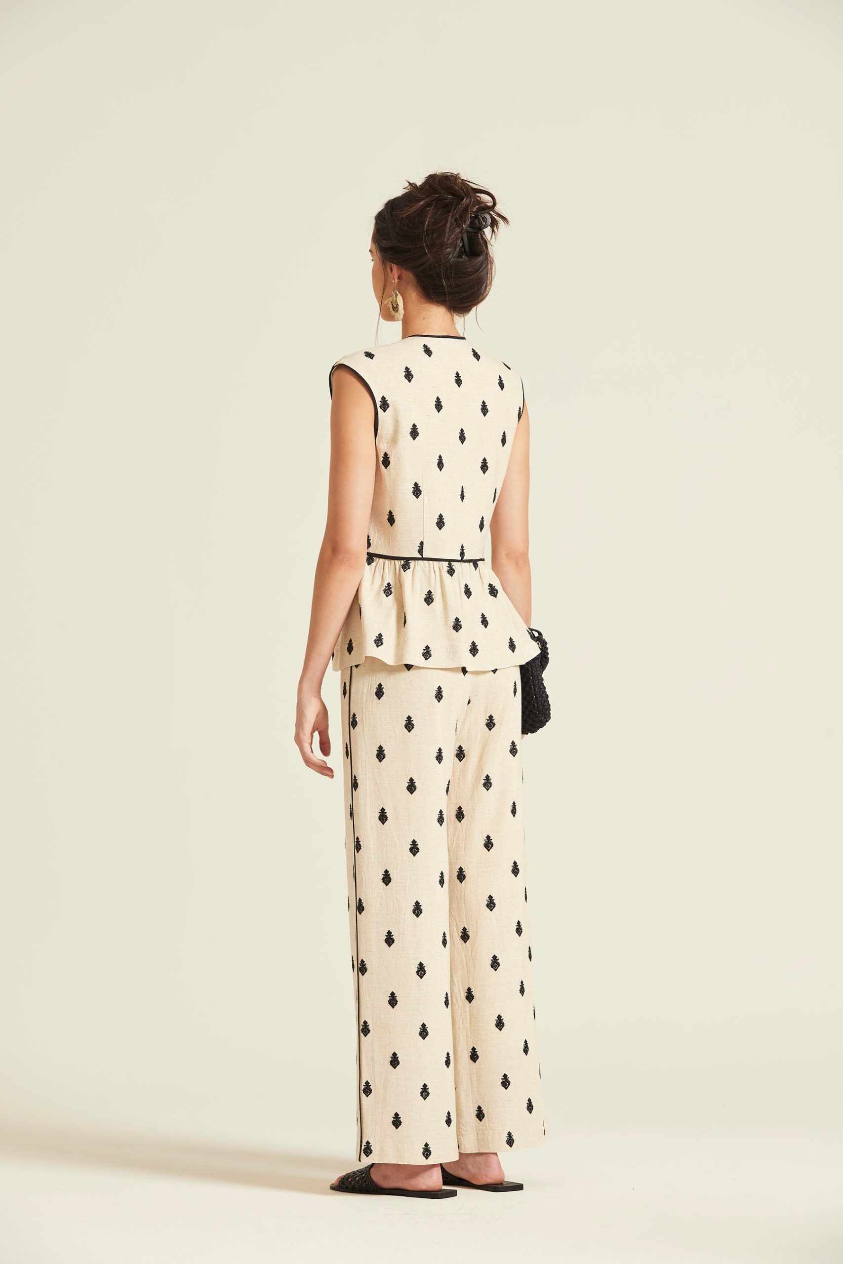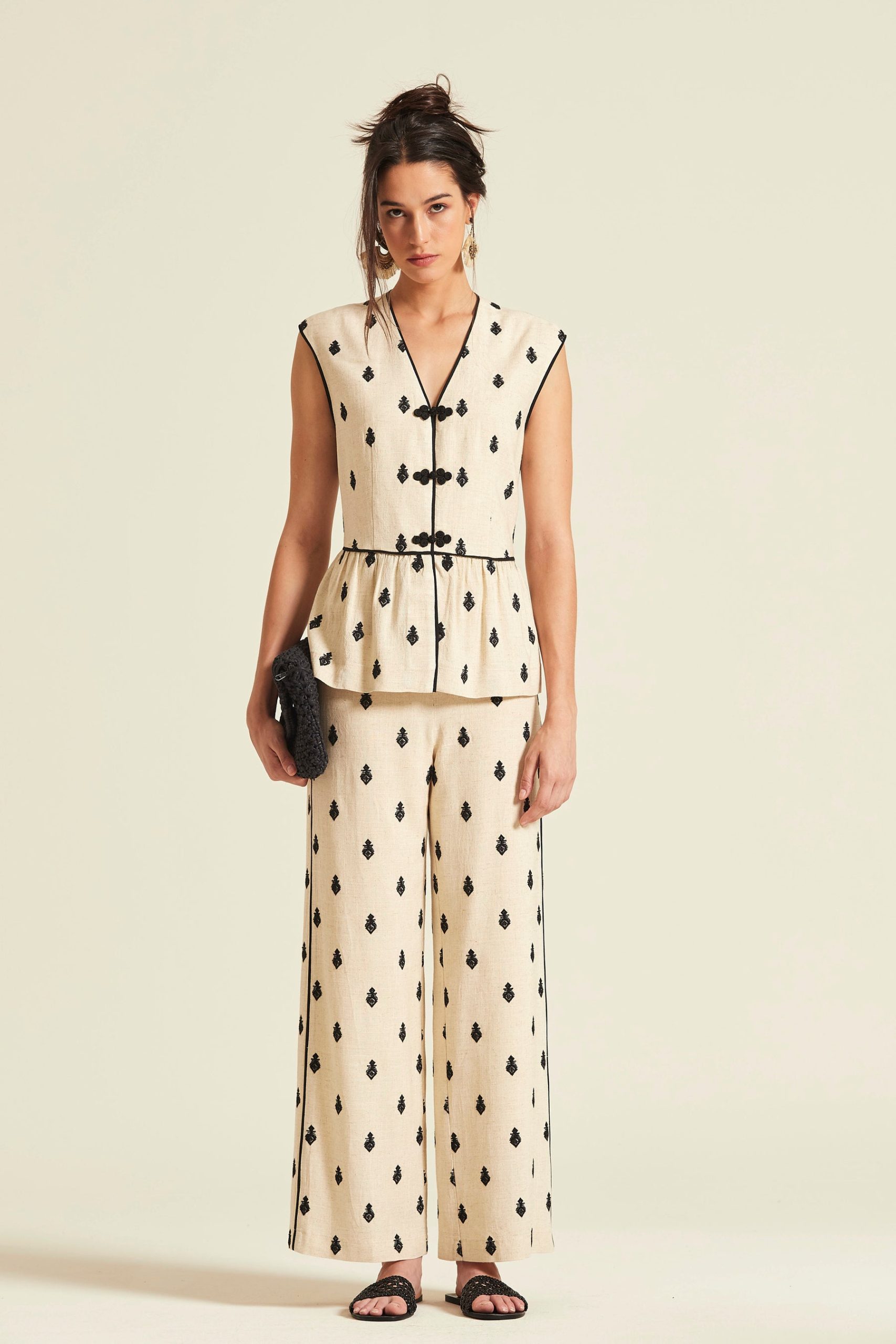 - Top de silueta peplum confeccionado en mezcla de viscosa y lino. Destaca por su escote en V con vivos a contraste, cierre frontal de botones artesanales y un delicado bordado geométrico integral en color negro sobre fondo crema.