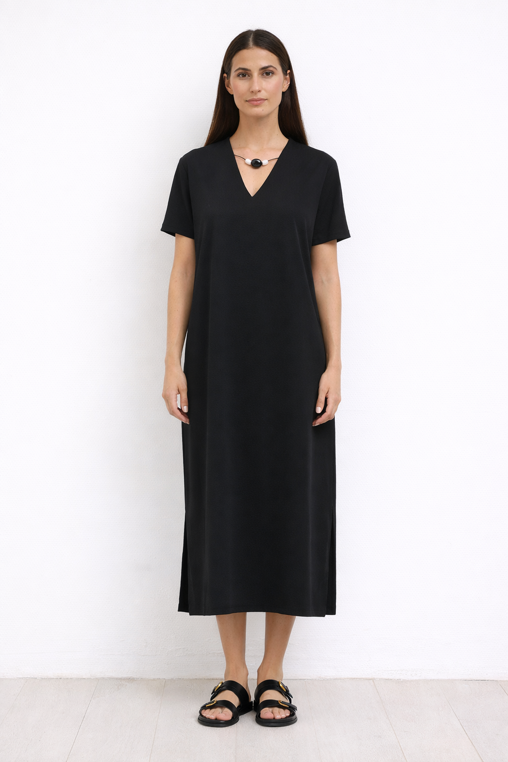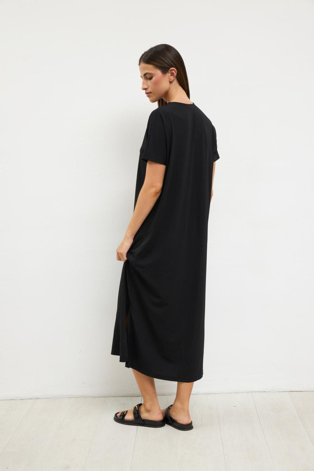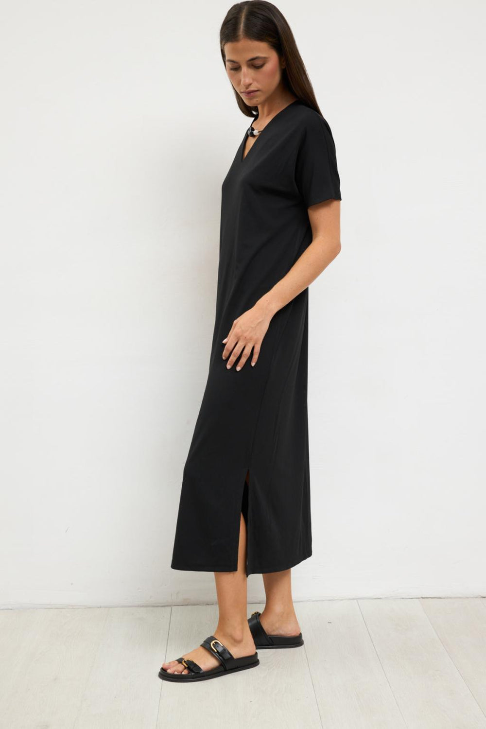 • Vestido midi de manga corta. Cuello de pico con detalle de aplique decorativo en el escote. Corte recto con aberturas laterales. Bajo recto.