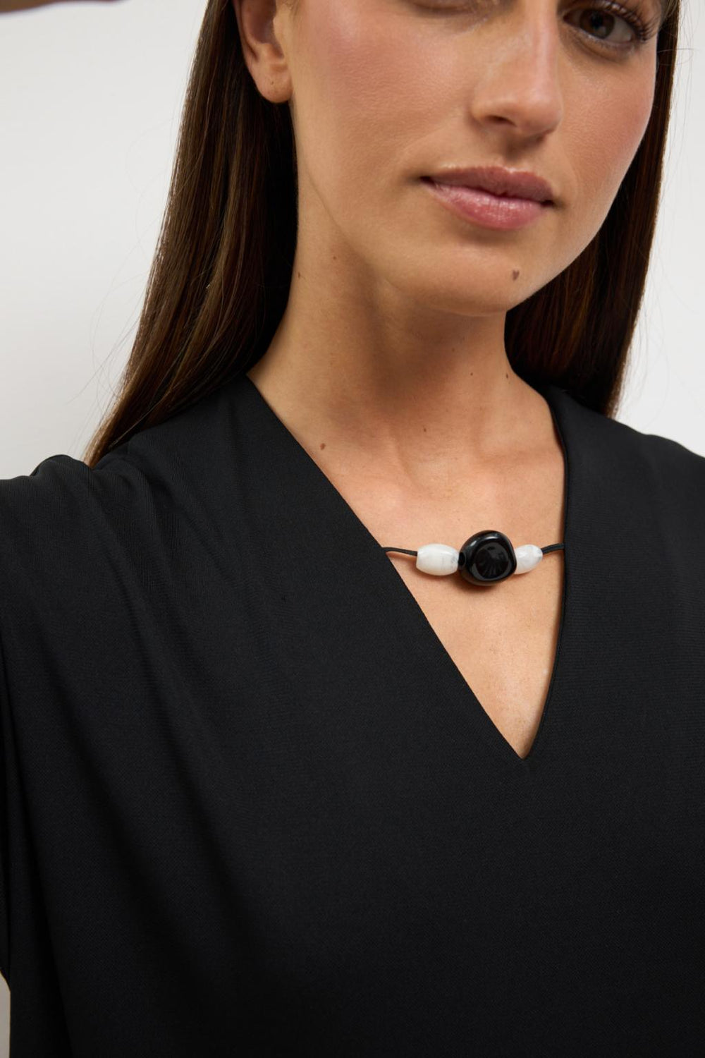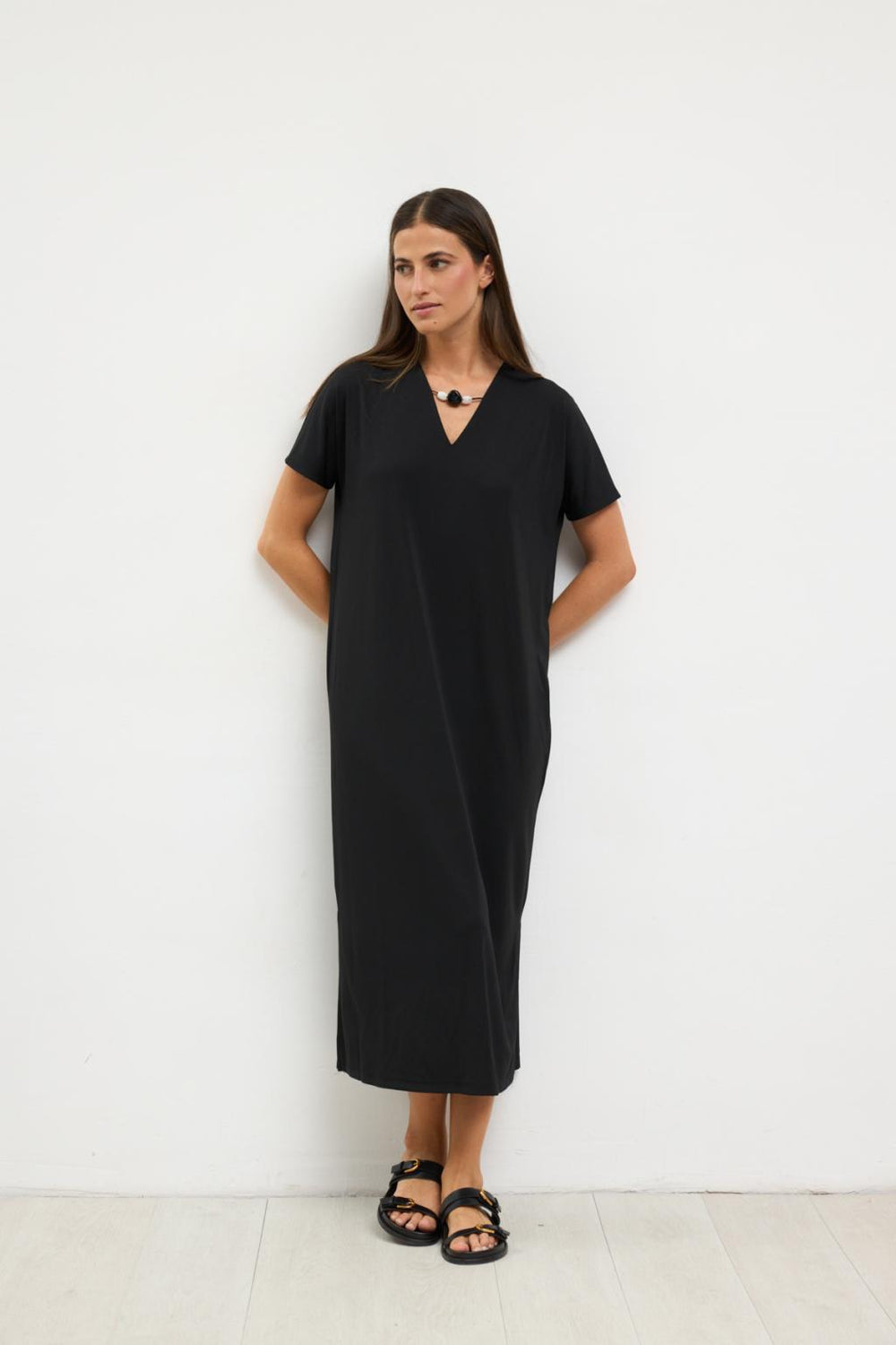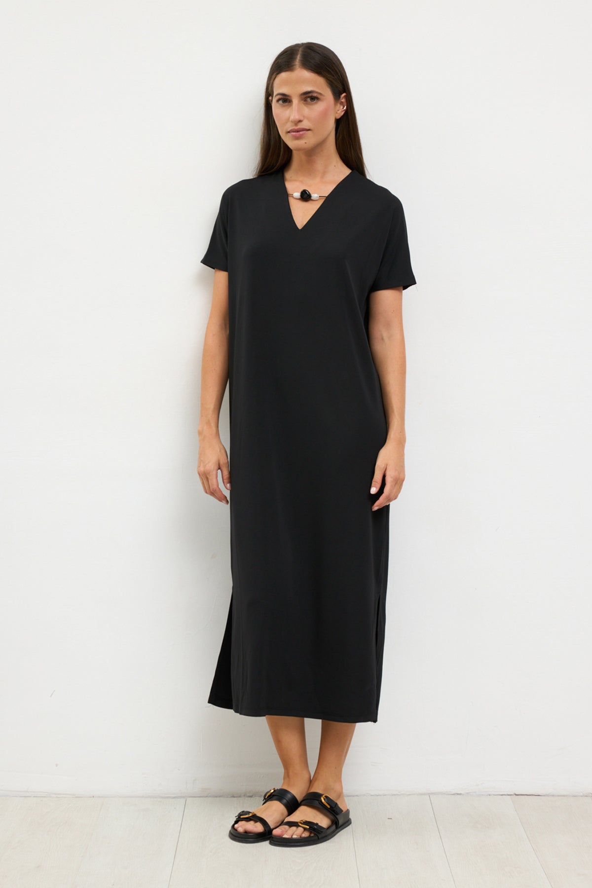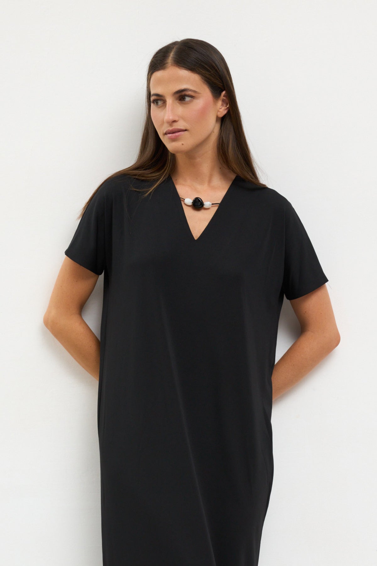 • Vestido midi de manga corta. Cuello de pico con detalle de aplique decorativo en el escote. Corte recto con aberturas laterales. Bajo recto.